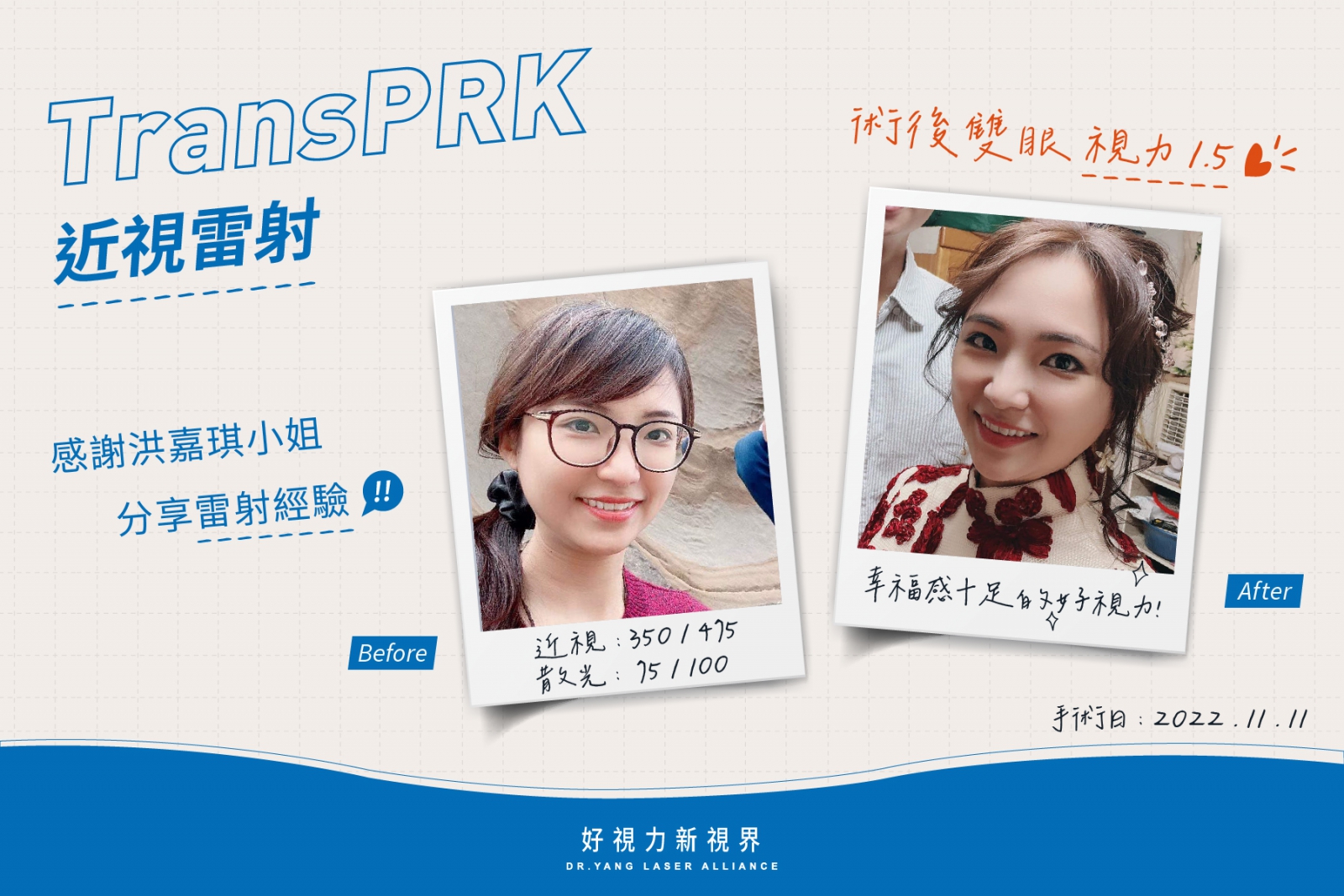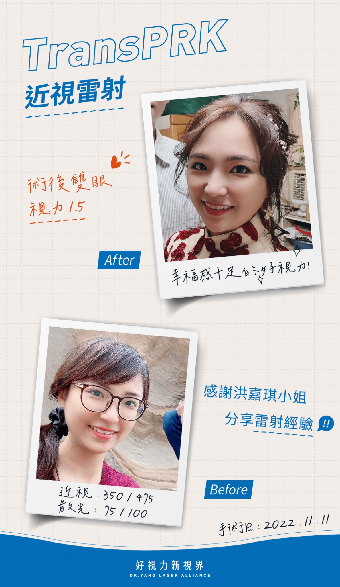雷射手術後至今也已經3個多月啦~~終於讓我擺脫尋找眼鏡的苦了,有多久沒有一睡醒,一睜眼就看的清清楚楚!半夜也用不著為了看清孩子的狀態而找眼鏡,還有再也不用忍受著戴口罩起霧、吃熱食起霧、尋找眼鏡等等的種種困擾了!!真心覺得近視雷射很值得,就像身旁有做過雷射的人說的一樣,後悔怎麼沒有早點做,早做早享受呀~~